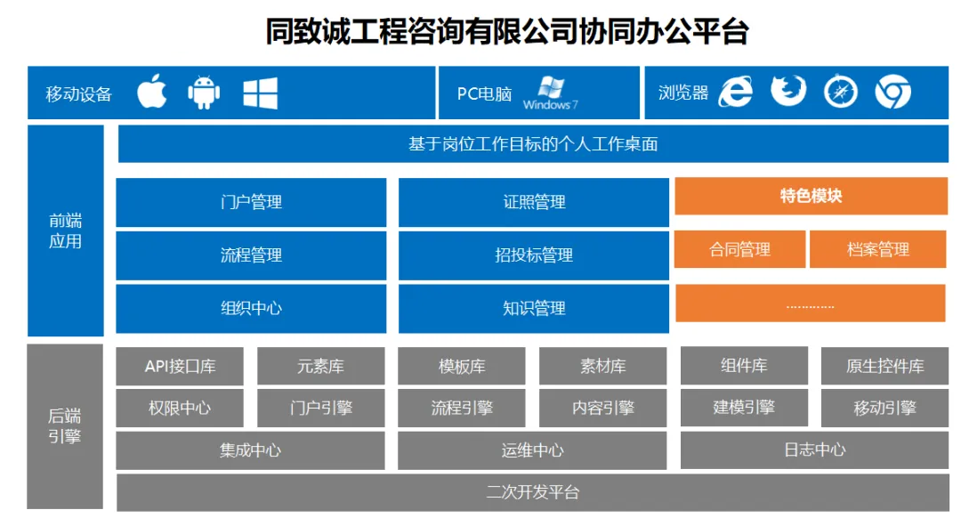 OA系统主要包括“门户管理、流程管理、组织中心、证照管理、招投标管理、知识管理、合同管理、档案管理”8个模块。各模板功能使用明确、清晰,待系统正式上线后,公司日常工作将实现全员网络化、移动化和远程化,突破企业人、财、物、信息、流程等各种资源之间的屏障,从而将集团、各分公司、各部门变成一个紧密联系的统一整体。