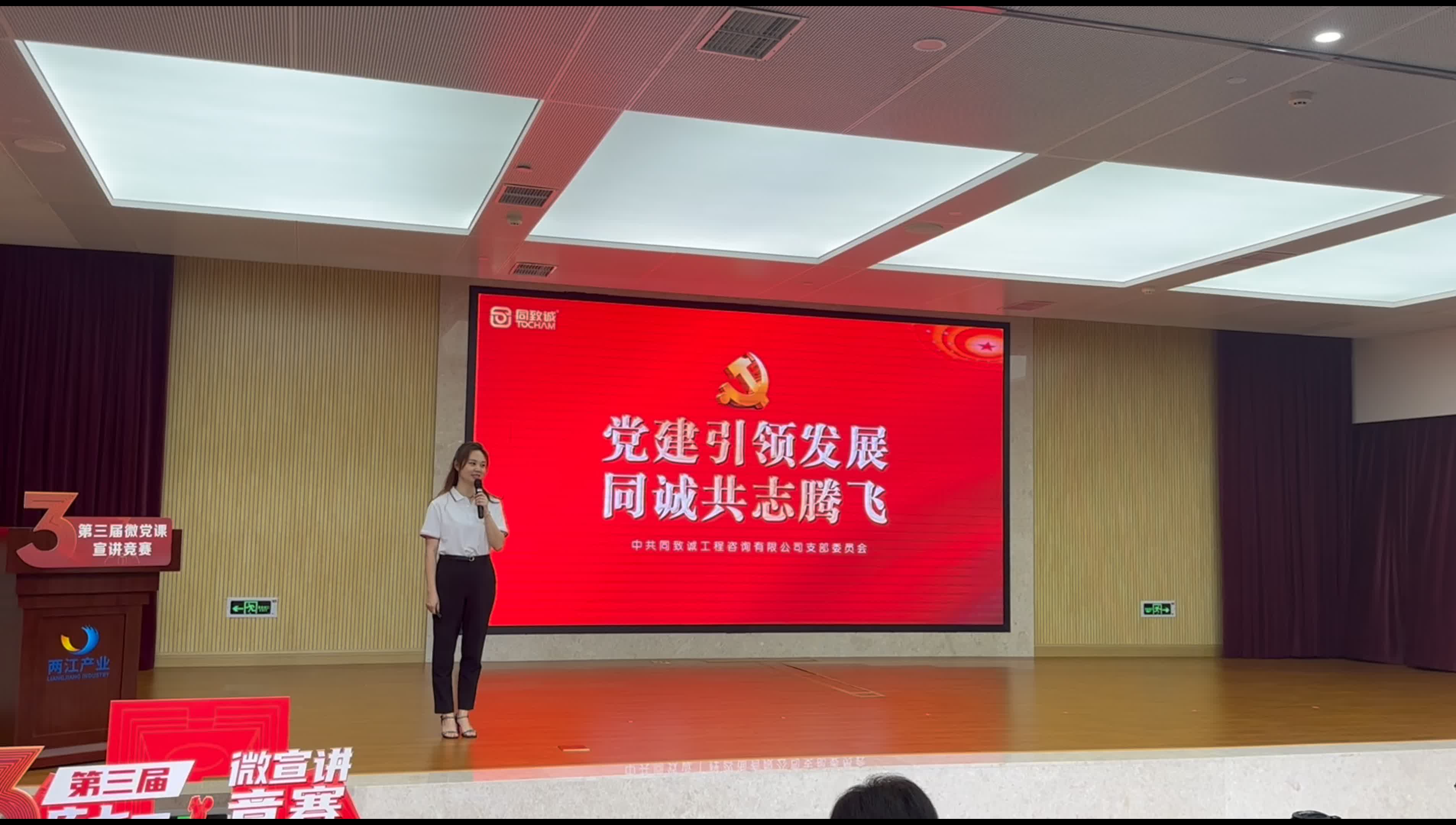 比赛中,赵燕同志以“党建引领发展 同诚共志腾飞”为主题,从党坚势盛,同频共振,做“新思想”的践行者;党魂永驻,大爱无疆,做“新征程”的奉献者;党建引领,共志腾飞,做“新重庆”的奋进者三个方面层层递进,讲述了同致诚人如何以习近平新时代中国特色社会主义思想为指导,紧跟党的步伐,坚持正确方向,为经济建设和工程项目的投资、决策与实施提供大量有价值的咨询、监理等服务,共同擘画新时代蓝图。