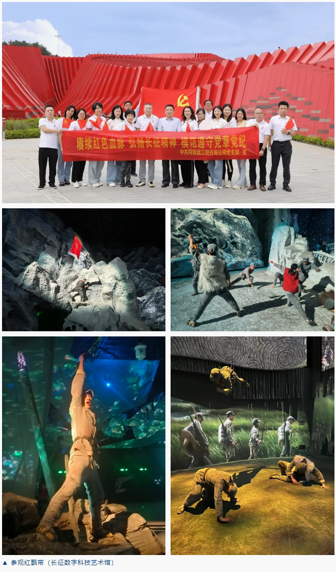 红飘带(长征数字科技艺术馆)是首个以长征为主题的全域行浸式数字体验馆,参观者可以“化作”历史的参与者,“重走”长征路。参观过程中,活动一行人置身一幕幕历史场景,在数字场景和真人演绎的方式下,大家通过无名英雄、血火洗礼、伟大转折、砥砺征途、胜利丰碑以及新时代新长征六个篇章身临其境地感受到那段艰苦卓绝的历史和红军的英勇事迹,更加深刻理解长征精神的内涵和意义。