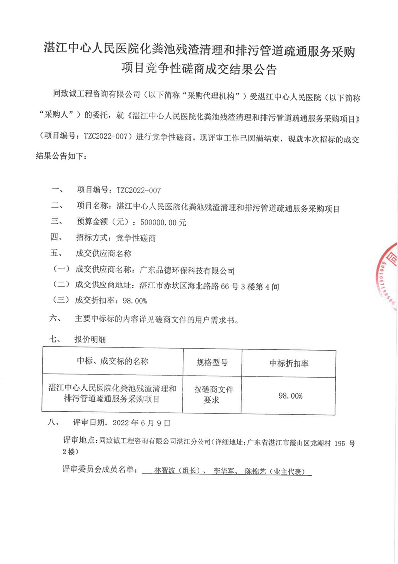 湛江中心人民医院化粪池残渣清理和排污管道疏通服务采购
