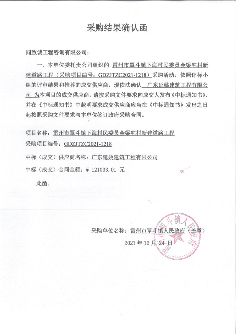雷州市覃斗镇下海村民委员会梁宅村新建道路工程 采购确认函