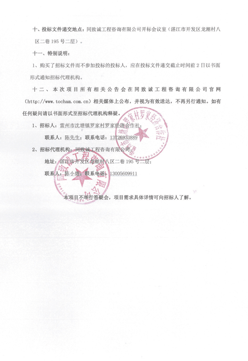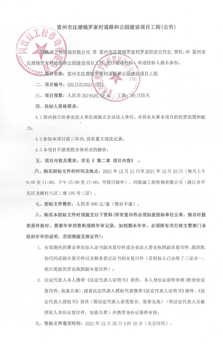 雷州市沈塘罗家村道路和公园建设项目工程公告