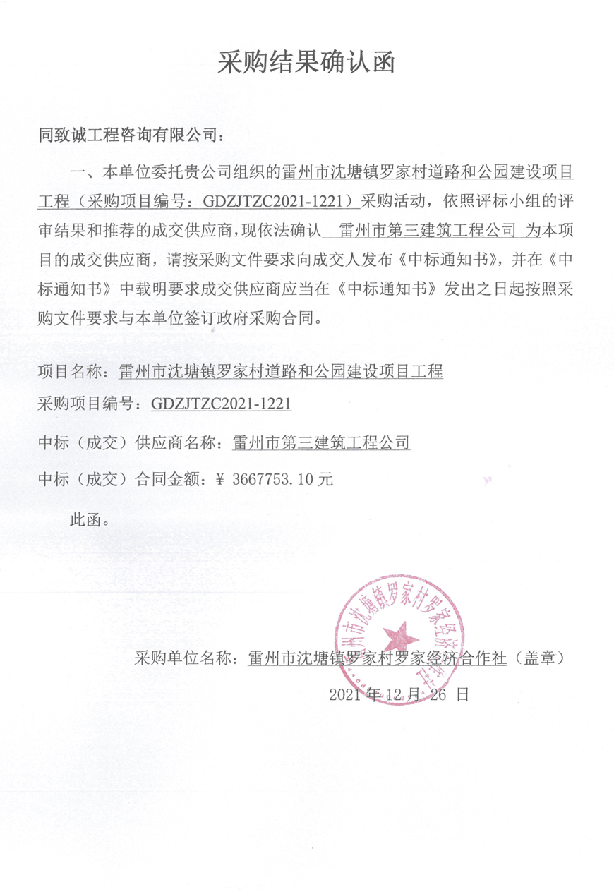 雷州市沈塘罗家村道路和公园建设项目工程确认函